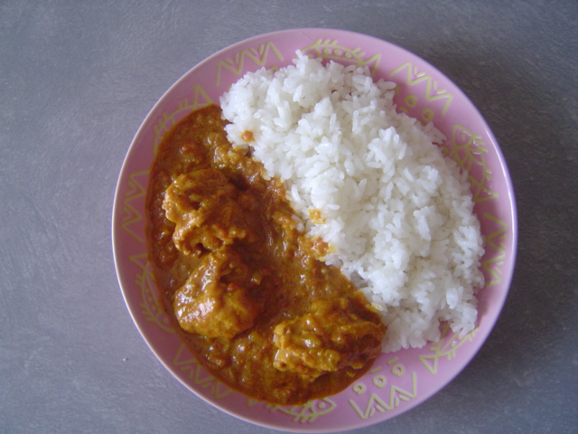 さてさて~ 上記の2サイトを参考にして「たまには珍しい味を味わいたいかも~!!脱!市販カレールー」を目指し時々作っています。 勿論、市販のカレールーで作るカレーも大好き!! 子供の頃から慣れ親しんだ味ですので、あれはあれでよい物です_(^^;)ゞ 料理のサイトを見た時は1回目は分量もそっくりレシピのままに作ってみますが、2回目からは自分なりのちょっとした工夫やらを織り交ぜて作っています。 *cookpadでは 鶏手羽元を遣う様になってますが、鶏モモ肉を使用しました。 以前作った時は低糖ヨーグルトを使いました。それはそれで美味しかったのですが、その場合分量の唐辛子では辛さが足りなかったので今回はプレーンヨーグルを使用。 【 材料 】「COOKPAD」とも「特選男の料理」とも多少違います!! 鶏モモ肉・・・400g プレーンヨーグルト・・・400g トマト水煮缶・・・400g×2缶*汁は使わない にんにくのみじん切り・・・1片 しょうがのすりおろし・・・1片 玉葱のみじん切り・・・2こ 赤唐辛子・・・4本 バター・・・40g カレー粉・・・大さじ4 塩・・・小さじ2 ウスターソース・・・小さじ2 水・・・6カップ 固形コンソメ・・・3個 チリペッパー りんごの蜂蜜煮(里香オリジナル) 【 作り方 】 鶏肉を一口大位(お好み)に切り分ける。 *調理に取りかかる3時間~半日前に鶏肉をヨーグルトに漬け込んでおく必要が有ります! そうする事で鶏肉がビックリするほど柔らかくなります。 *ヨーグルトは低糖でも良いが仕上がりが甘くなります。 ①唐辛子を香りが出る位バターで炒める。 ②①にしょうが、にんにく、玉葱のみじん切りを入れ、あめ色になる位まで良く炒める。 *特選男の料理では「ギー」or「無塩バター」を使うと良いとあるので次回試してみたいと思う。 ③②にカレー粉を入れ良く炒める *炒め方が足りないと粉っぽくなるそうですので要注意! ④あらかじめ水気を切っておいたトマト水煮を③に加え、水気が無くなるまで炒める。